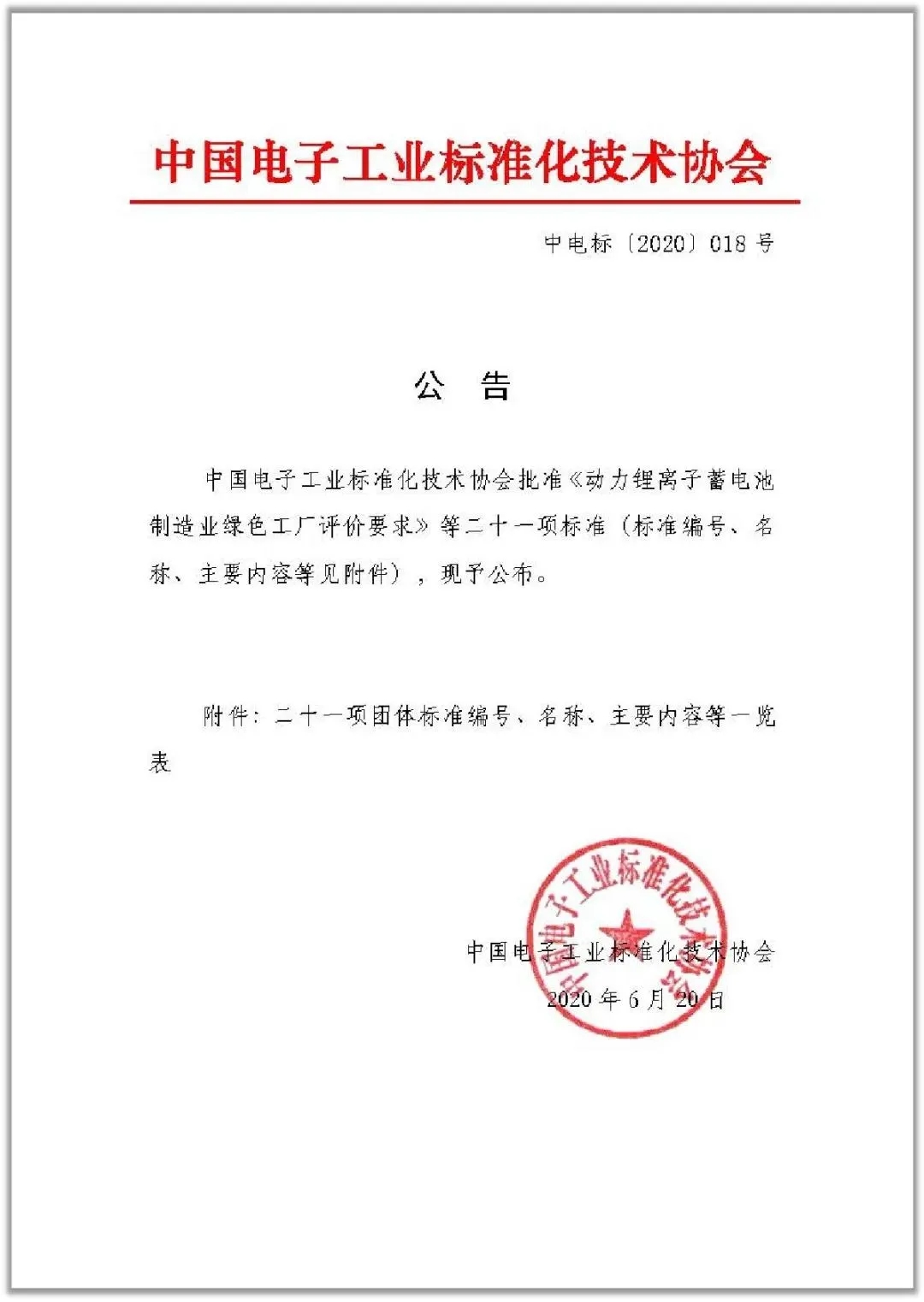 近日,中國電子工業(yè)標準化技術(shù)協(xié)會批準《動力鋰離子蓄電池制造業(yè)綠色工廠評價要求》等二十一項標準,本標準由中國電子技術(shù)標準化研究院、全國綠色工廠推進聯(lián)盟提出。