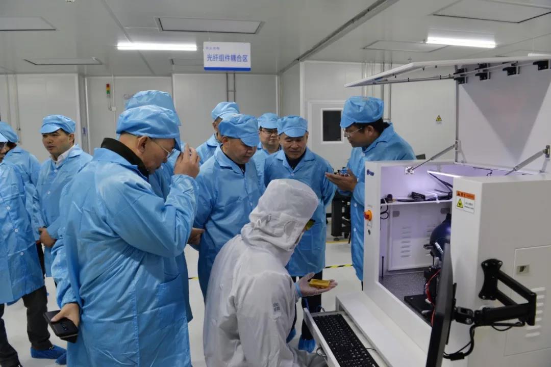 揭牌儀式后,各級(jí)領(lǐng)導(dǎo)前往中久光電產(chǎn)線參觀,實(shí)地考察了激光器產(chǎn)品的生產(chǎn)工藝及加工生產(chǎn)線。